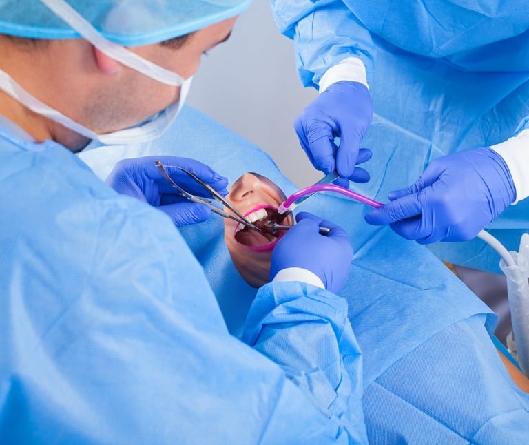 Tratamientos quirúrgicos para corregir problemas dentales graves, como extracción de muelas del juicio, corrección de mandíbulas y tratamientos de lesiones orales.